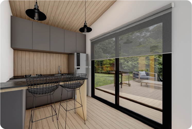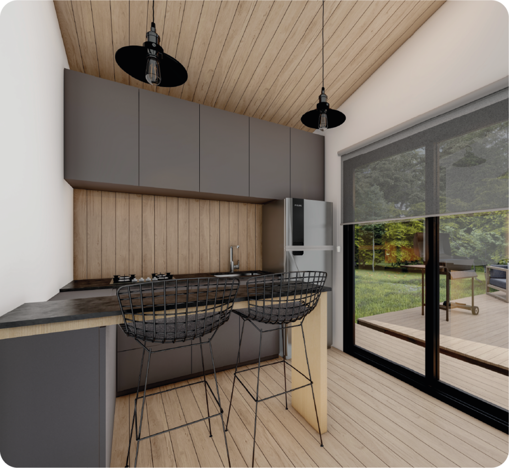 Cocina mesada de granito leather, muebles de cocina completo con barra desayunadora, bacha Al Johnson, termotanque eléctrico integrado 50 ltrs