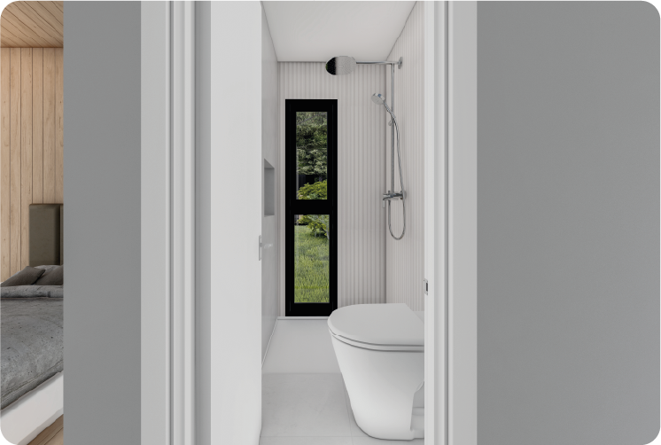 Baño piso porcelanato, revestimiento cerámica esmaltada, plato de ducha acrílico reforzado, cuerpo de ducha exterior