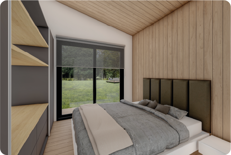 Dormitorio placard doble y cajonera integrada para mueble de TV en melamina Egger, revestimiento vinílico simil madera en cielorraso y pared